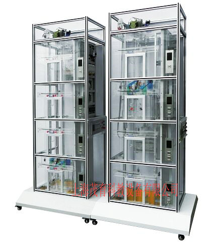 1、由兩臺四層透明仿真教學客梯組成,由層外兩處按鈕共同控制。