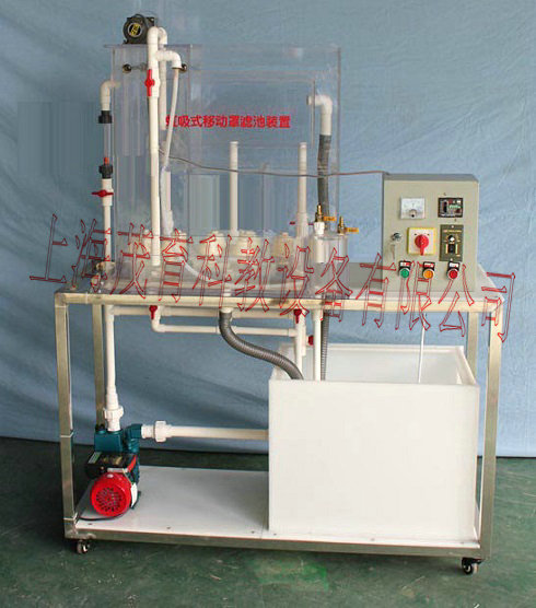 1、移動罩濾池:透明有機玻璃材質(zhì)、厚度10mm,包含進水管、濾層、底部集水區(qū)、出水虹吸管、出水堰口、水位恒定器、沖洗罩、桁車(傳動裝置1套、滑動導(dǎo)軌1副)、濾格、隔墻、排水槽、排水總槽、出水總管、傳動裝置、沖洗泵;