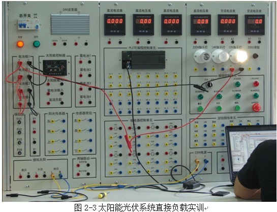 3、太陽能光伏系統(tǒng)直接負載實訓(xùn):將電池板的輸出端串并成24v電壓輸出形式,將線直接接到24v負載兩端,觀察電壓電流的變化情況。在將電池板的輸出端串并成12v電壓輸出形式,將線直接接到12v負載兩端,觀察電壓電流的變化情況。如圖2-3所示: