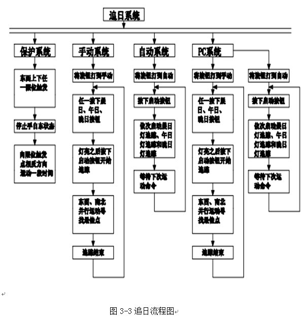 3、追日流程: 追日系統(tǒng)是由plc程序控制光源模擬跟蹤裝置運行,追日流程圖如圖3-3所示: