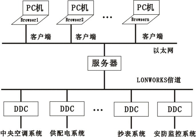 現(xiàn)場總線樓宇綜合控制系統(tǒng)是智能樓控系統(tǒng)的一個重要發(fā)展方向,而基于LonWorks總線的樓控網(wǎng)絡(luò)系統(tǒng)是目前智能建筑發(fā)展的一種主流,2006年LonTalk協(xié)議成為中國國家標(biāo)準(zhǔn)化指導(dǎo)性技術(shù)文件GB/Z 20177.1-2006,為更好地滿足智能樓宇教學(xué)的需要,推出了一系列基于LON總線的智能樓宇教學(xué)實(shí)驗(yàn)裝置。本系統(tǒng)是此類系列產(chǎn)品之一。它具備IBMS系統(tǒng)兩級網(wǎng)絡(luò)和三層管理(控制)的典型結(jié)構(gòu),即采用現(xiàn)場總線網(wǎng)(Lonwalks信道)和由B/S結(jié)構(gòu)構(gòu)成的局域網(wǎng)兩級網(wǎng)絡(luò)結(jié)構(gòu),現(xiàn)場(DDC)控制、過程管理(服務(wù)器)、遠(yuǎn)程客戶管理三層管理結(jié)構(gòu)。