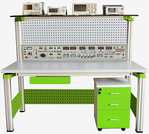本實訓臺主要由實訓主機箱、儀器架、電源控制箱、獨立實訓電路模塊、實訓桌(含磁吸式實訓基座)、儲存柜、學生凳等組成。