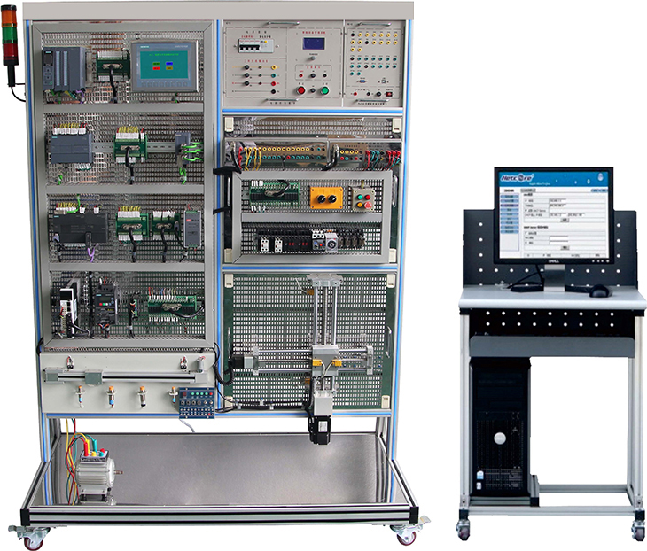 實訓(xùn)裝置由S7-1500單元、S7-1200單元、ET200SP單元、變頻調(diào)速單元、小車運動控制單元、、實訓(xùn)組件、電工基礎(chǔ)實訓(xùn)單元二維絲桿控制單元、觸摸屏單元、以太網(wǎng)交換機(jī)、交流電機(jī)等組成。