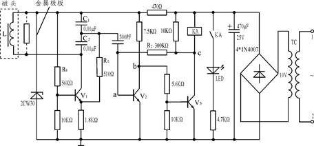 當(dāng)金屬極板接近磁頭(振蕩線圈)時(shí),晶體管V1停振,V2基極上沒(méi)有了附加的負(fù)向振蕩信號(hào),而使V2由截止轉(zhuǎn)向?qū),V3截止,繼電器KA釋放,指示燈熄滅。