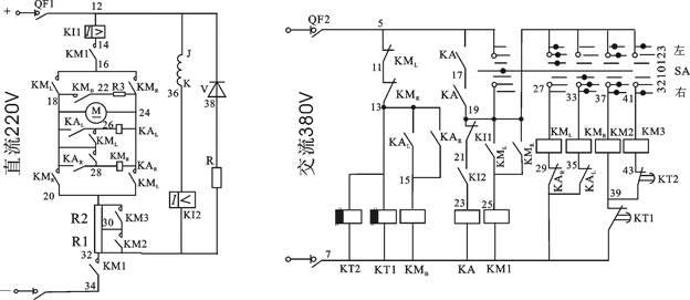 R電樞電壓為左負(fù)右正,這樣就改變了電樞電壓的極性,而并勵繞組的電流方向沒有變,所以實(shí)現(xiàn)了反轉(zhuǎn)控制;其次停車時(shí)采用能耗制動,且利用電壓繼電器KAL或KAR控制,它們的線圈在工作時(shí)與電動機(jī)