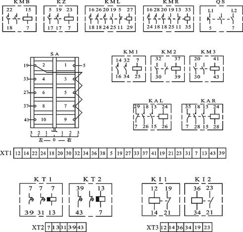 當(dāng)用主令開關(guān)手柄從正轉(zhuǎn)扳到反轉(zhuǎn)時(shí),電路本身能保證先進(jìn)行能耗制動,后改變轉(zhuǎn)向。這時(shí)利用繼電器KAL在制動結(jié)束以前一直處于是吸合狀態(tài),從而斷開了反轉(zhuǎn)接觸器KMR線圈的回路,故即使主令開關(guān)處于反轉(zhuǎn)第3檔,也不能接通反轉(zhuǎn)接觸器。當(dāng)主令開關(guān)從反轉(zhuǎn)瞬時(shí)板到正轉(zhuǎn)時(shí),情況類似。