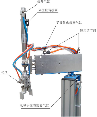 整個搬運機構能完成四個自由度動作,手臂伸縮、手臂旋轉、手爪上下、手爪緊松。