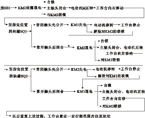 按SB1,觀察并調(diào)正電動(dòng)機(jī)M為正轉(zhuǎn)(模擬工作臺(tái)向右移動(dòng)),用手代替檔塊按壓SQ1,電動(dòng)機(jī)先停轉(zhuǎn)再反轉(zhuǎn),即可使SQ1自動(dòng)復(fù)位(反轉(zhuǎn)模擬工作臺(tái)向左移動(dòng));用手代替檔塊按壓SQ2再使其自動(dòng)復(fù)位,則電機(jī)先停轉(zhuǎn)再正轉(zhuǎn)。以后重復(fù)上述過(guò)程,