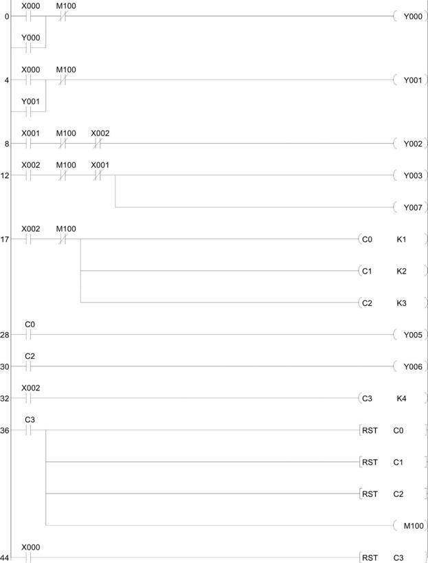 0 LD X000 1 OR Y000 2 ANI M100 3 OUT Y000 4 LD X000 5 OR Y001 6 ANI M100 7 OUT Y001 8 LD X001 9 ANI M100 |