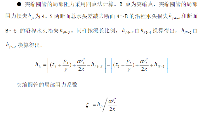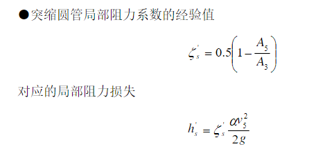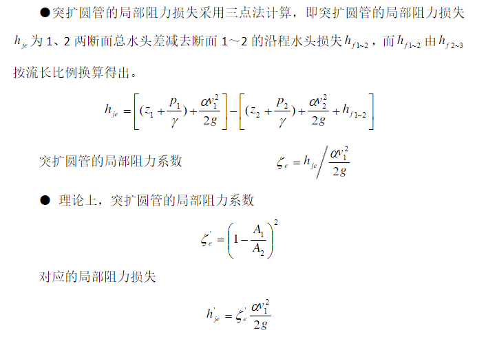 突擴(kuò)和突縮圓管的局部阻力損失由前后兩斷面的能量方程,根據(jù)推導(dǎo)條件,扣除沿程水頭損失求得。