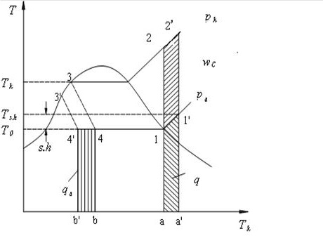 根據穩(wěn)定流動連續(xù)定理,流經回熱器的液態(tài)制冷劑和氣態(tài)制冷劑的質量流量相等。因此,在對外無熱損失情況下,每公斤液態(tài)制冷劑放出的熱量應等于每公斤氣態(tài)制冷劑吸收的熱量。也就是說,單位質量制冷劑再冷卻所增加的制冷能力△q0(面積b'4'4bb')等于單位質量氣體制冷劑所吸收的熱量△q(面積a11'a'a)。由于有了回熱器,雖然單位質量制冷能力有所增加,但是,壓縮機的耗功量也增加了△w0(面積11'2'21)。因此,回熱式蒸氣壓縮制冷循環(huán)的理論制冷系數有可能提高,也有可能降低,應具體分析。