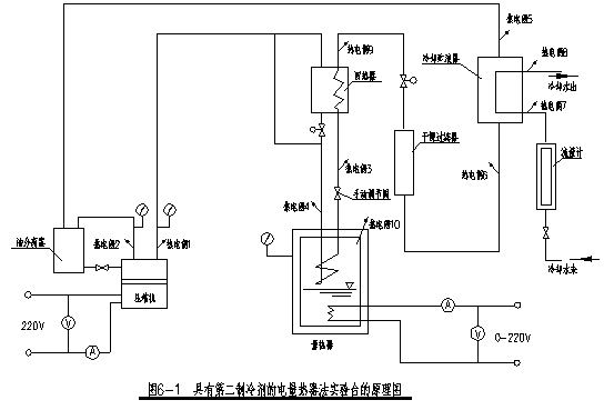 制冷壓縮機的制冷量的測試有幾種方法,其中采用具有第二制冷劑的電量熱器法是最精確的方法之一。具有第二制冷劑的電量熱器法實驗臺的原理見圖6-1。