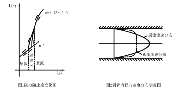 2.不同流動形態(tài)的沿程水頭損失與斷面平均流速的關系是不同的。層流流動中的 沿程水頭損失與斷面平均流速的1次方成正比。紊流流動中的沿程水頭損失與斷面平均流速的1.75~2.0次方成正比。見圖 1、圖 2。