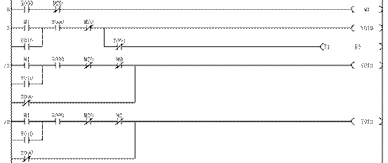 56 ORI X000 57 OUT Y015 58 LD T1 59 OR Y004 60 AND X000 61 ANI M20 62 ANI M5 63 ORI X000 64 OUT Y011 65 LD T2 66 OR Y005 67 AND X000 68 ANI M20 69 OUT Y005 70 MPS 71 ANI M4 72 OUT M3 73 MPP 74 ANI Y006 75 OUT T3 K5 78 LD T3 79 OR Y006 80 AND X000 81 ANI M20 82 OUT Y006 83 MPS 84 ANI M6 85 OUT M5 86 MRD 87 ANI M8 |