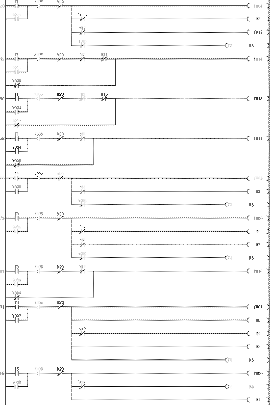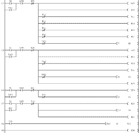121 ANI Y001 122 OUT T6 K5 125 MPP 126 OUT M4 127 LD T6 128 OR Y001 129 AND X000 130 ANI M20 131 OUT Y001 132 OUT M10 133 MPS 134 ANI M12 135 OUT M11 136 MRD 137 ANI M14 138 OUT M13 139 MRD 140 ANI M16 141 OUT M15 142 MRD 143 ANI M18 144 OUT M17 145 MPP 146 ANI Y002 147 OUT T7 K5 150 LD T7 151 OR Y002 152 AND X000 153 ANI M20 |