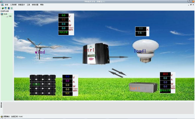 2.顯示監(jiān)控內(nèi)容:蓄電池電壓、風(fēng)機(jī)電壓、光伏電壓、風(fēng)機(jī)電流、光伏電流、風(fēng)機(jī)功率、光伏功率,能量模擬圖,當(dāng)前風(fēng)速(米/秒),當(dāng)前風(fēng)向(度),當(dāng)前風(fēng)力資源評(píng)估。